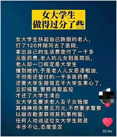 某平臺曾經(jīng)有這么一個短視頻,引起幾十萬的點贊。一個女大學生扶起一位自己跌倒的老人,并打120陪同老人去了醫(yī)院,還先期墊付了1000多的藥費;結(jié)果是什么?老人的兒女到了醫(yī)院后,被扶的老人卻一口咬定撞倒他的是女生,所以老人子女不僅沒有感謝女學生,反而惡語相向,拒不返還前期墊付的藥費,還要向女生索賠5000元。
